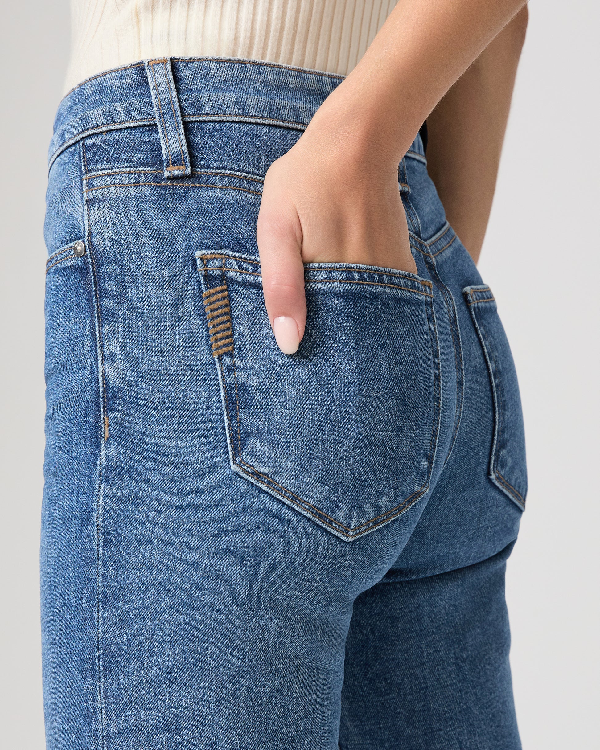 Sofia is our fresh take on the flare. This modern mid-rise silhouette sits straight across the waist and gently relaxes through the knee before breaking into a soft flare. In the perfect medium wash, this pair is crafted from heritage-inspired denim with a soft hand-feel and a hint of stretch.